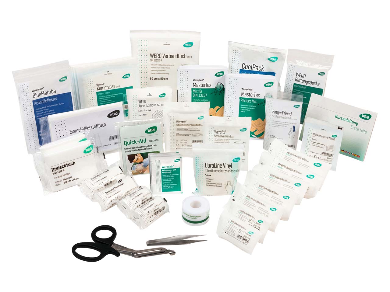 Neben der Füllung gemäß DIN 13157 erhalten Sie weitere Produkte dazu: Werofix Schnellverband, Werotex selbstklebende Pflasterbinde, WER FingerFriend, Finger- und Schlauchverband, Weroplast MasterTex Perfect Mix, Splinterpinzette, WERO Quick Aid Einmal-Notbeatmungshilfe, Weroskin Reinigungs- und Pflegetücher, Weroplast BlueMamba Schnellpflaster, Mullkompressen sowie verschiedene WERO Verbandpäkchen.