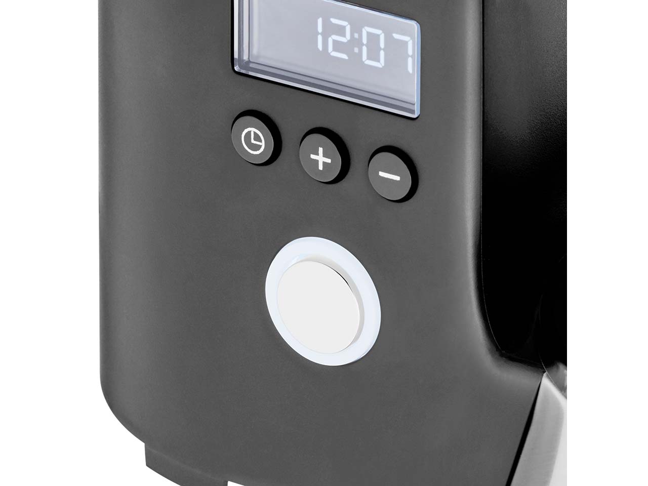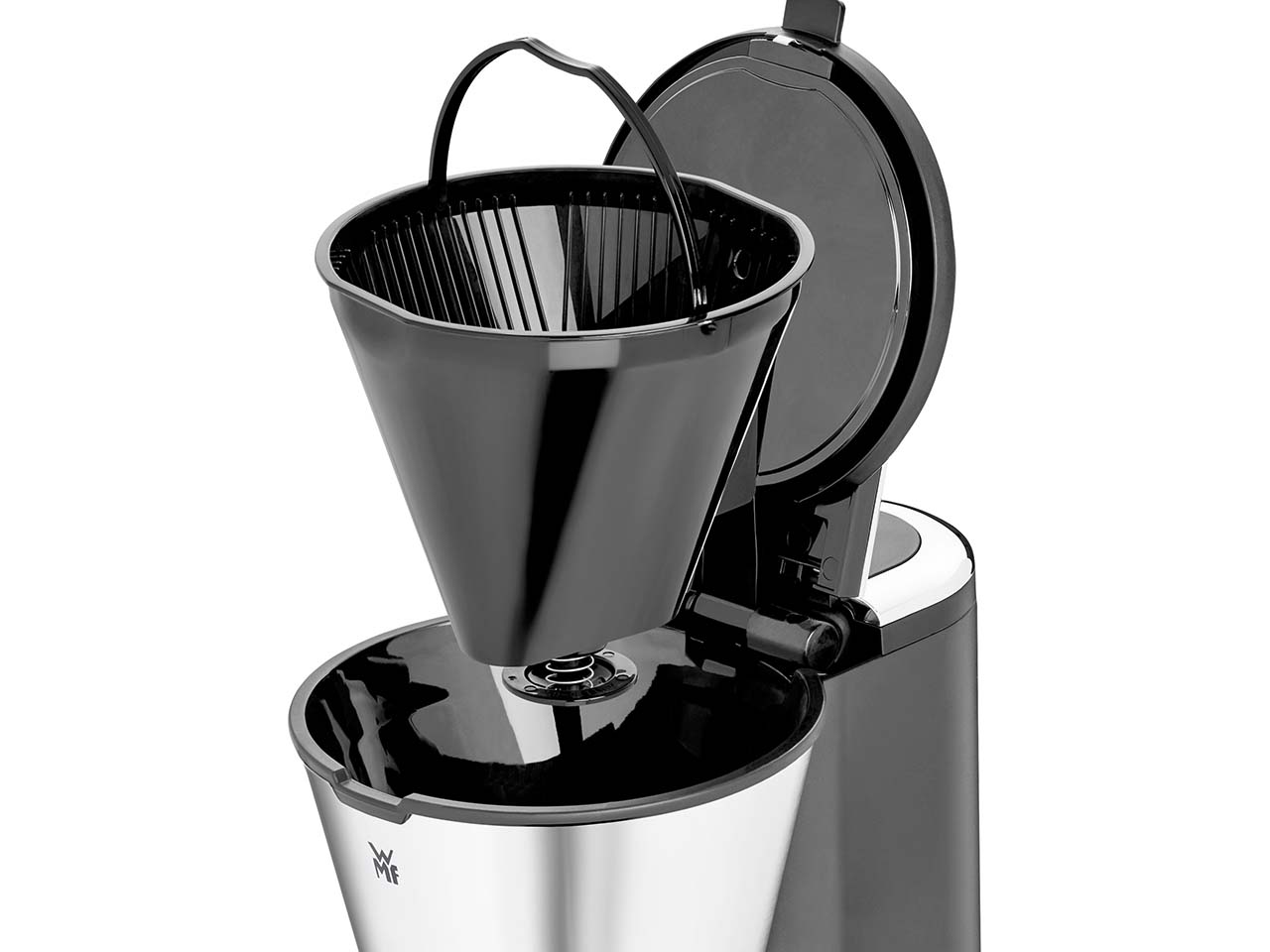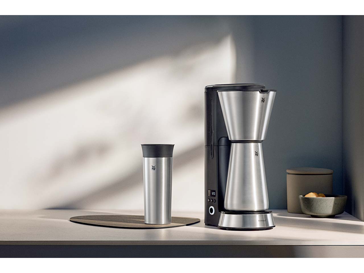 Aromatischer Kaffeegenuss, der nicht viel Platz braucht! Die modern und kompakt designte Mini-Filterkaffeemaschine von WMF ist mit cleveren Funktionen versehen und leistet exzellente Arbeit. Dank 24-Stunden-Timer kann Kaffee zu jeder Zeit genossen werden. Das Beste: Der Kaffee lässt sich direkt im eleganten Thermobecher für unterwegs zubereiten! Der perfekte To-go-Kaffee ohne Papp- und Plastikbecher. Es stehen insgesamt zwei austauschbare Deckel zur Verfügung, wovon einer einen Henkel hat. Die Kaffeemaschine verfügt über ein LC-Display, ein Entkalkungsprogramm und eine automatische Abschaltfunktion.