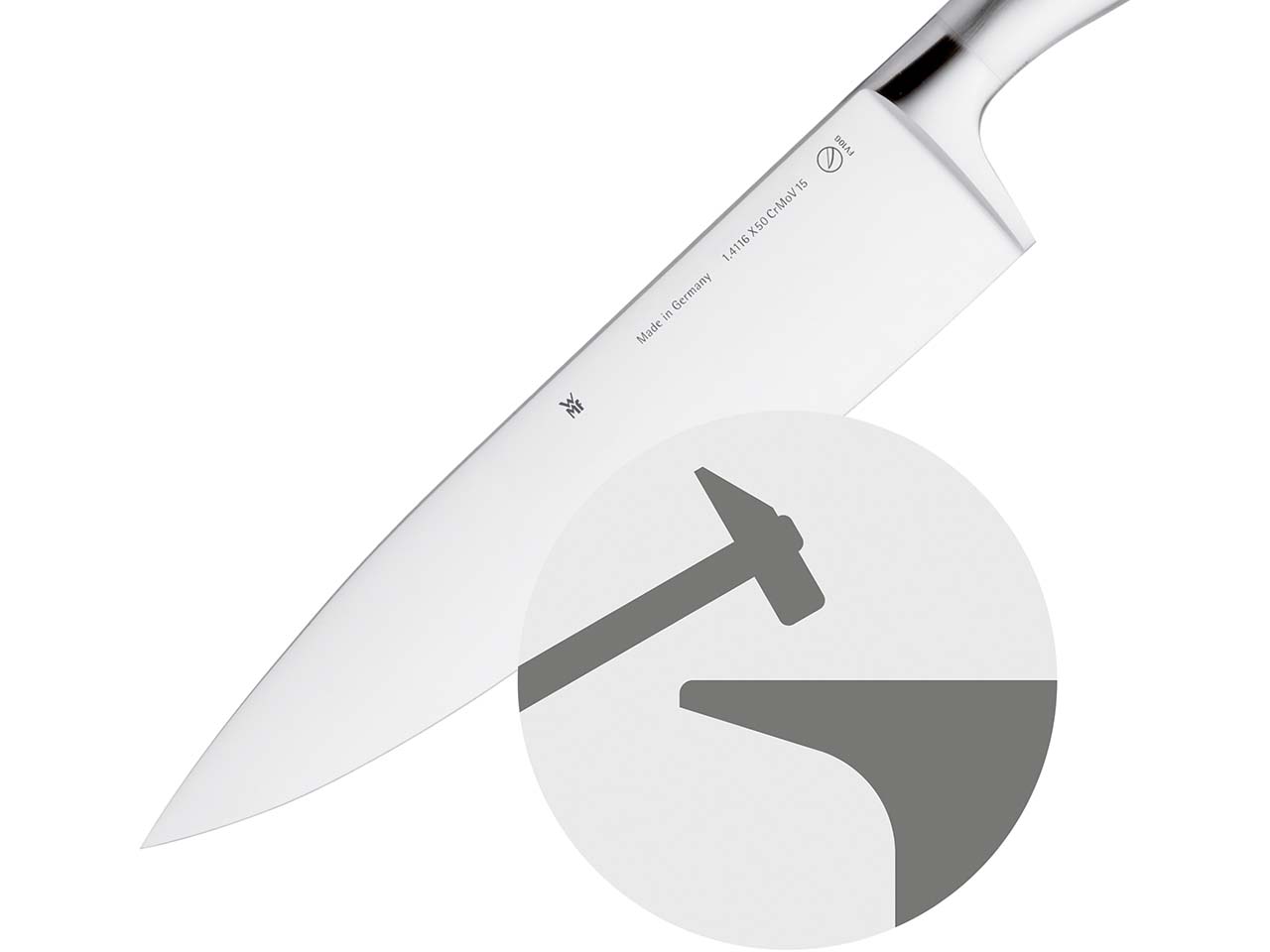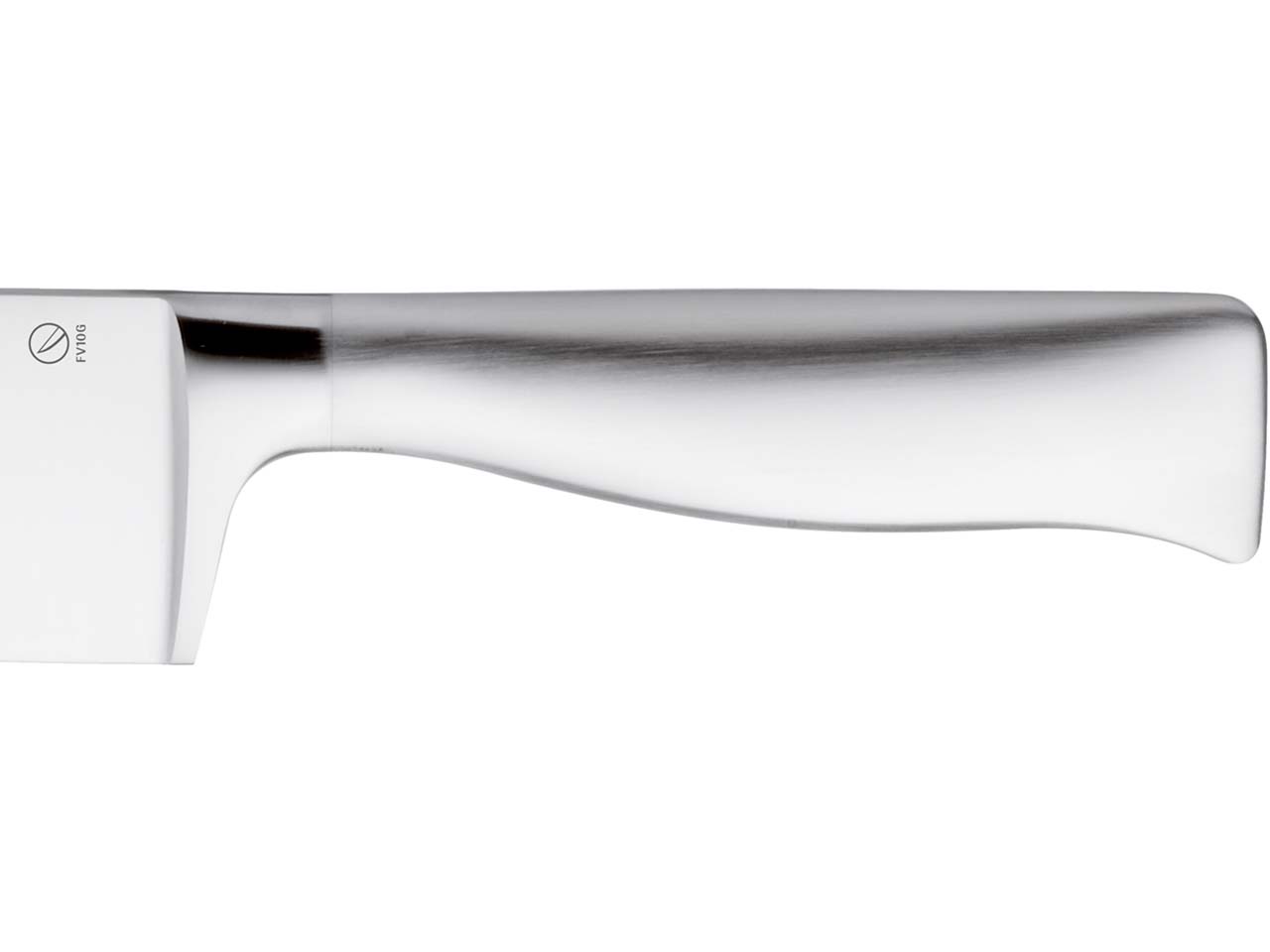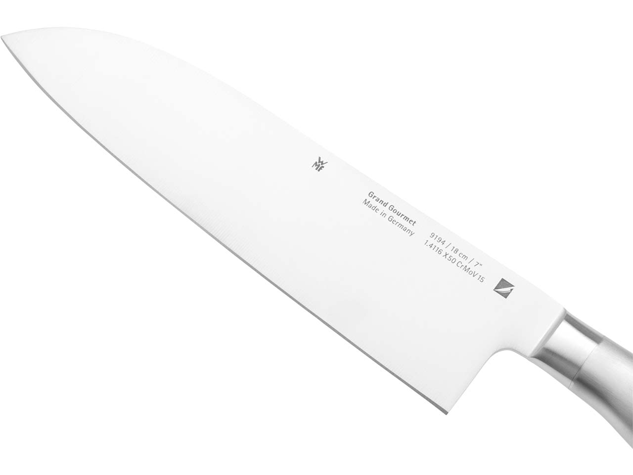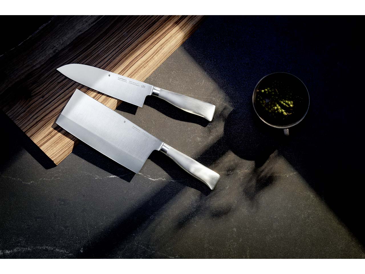 Ein Santokumesser gehört in jede Küche, in der Fisch, Fleisch oder Gemüse geschnitten oder gehackt wird! Die besondere Formgebung zeichnet das Messer aus. Die Klinge aus korrosions- und säurebeständigem Spezialstahl ist dank WMF Performance Cut besonders scharf. Bei dieser Technologie wird die Klinge per Laser vermessen und in einem optimalen Schleifwinkel in einem bisher unerreichten spitzen Winkel geschliffen. Das Santokumesser liegt angenehm in der Hand. Die fugen- und übergangslose Verarbeitung aus einem Guss sorgt dafür, dass es einfach sauber gehalten werden kann.