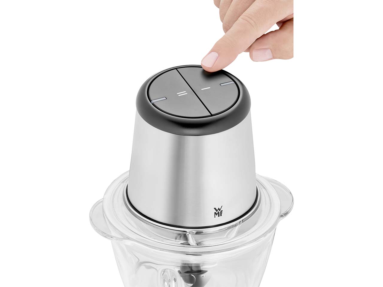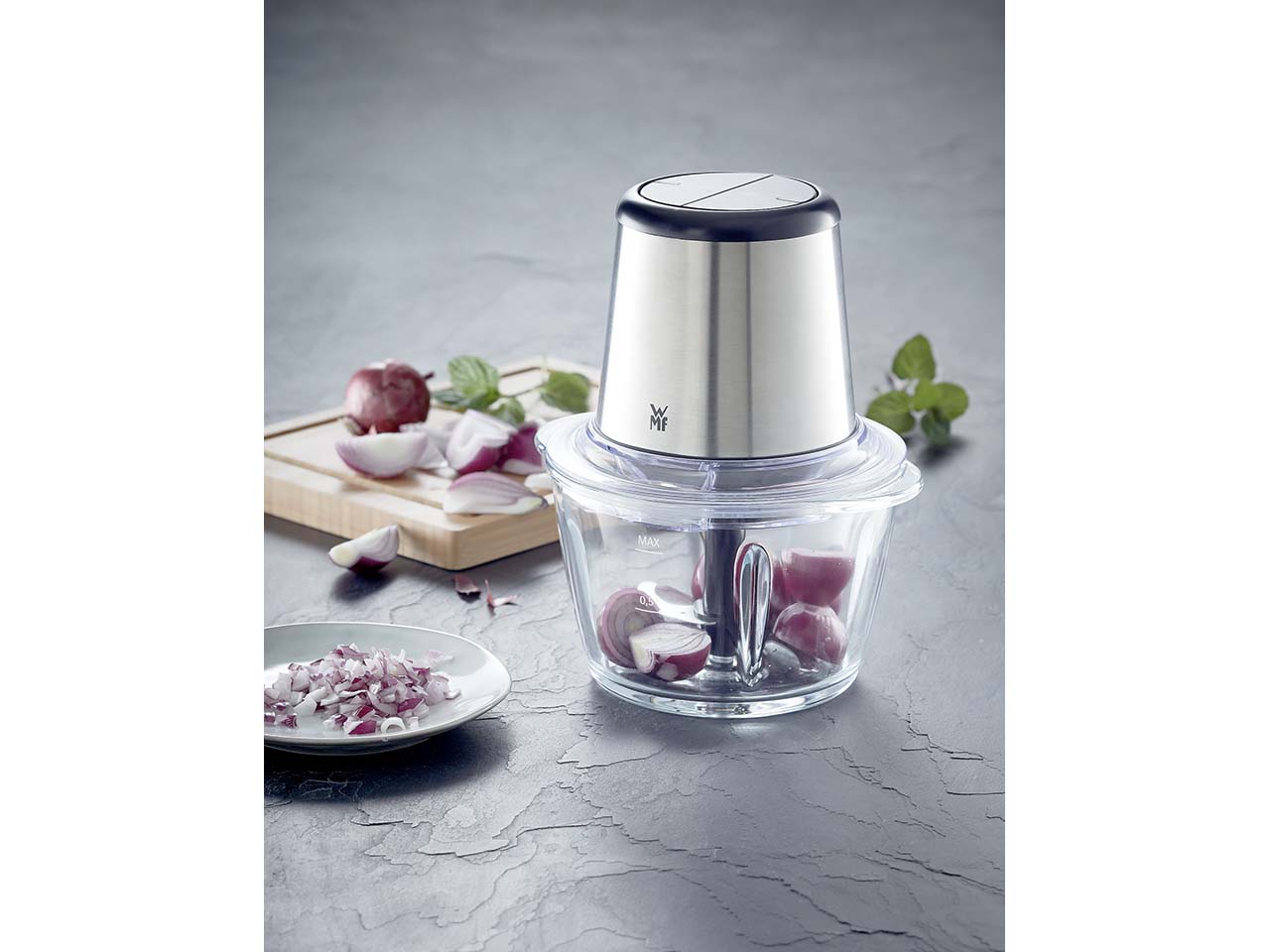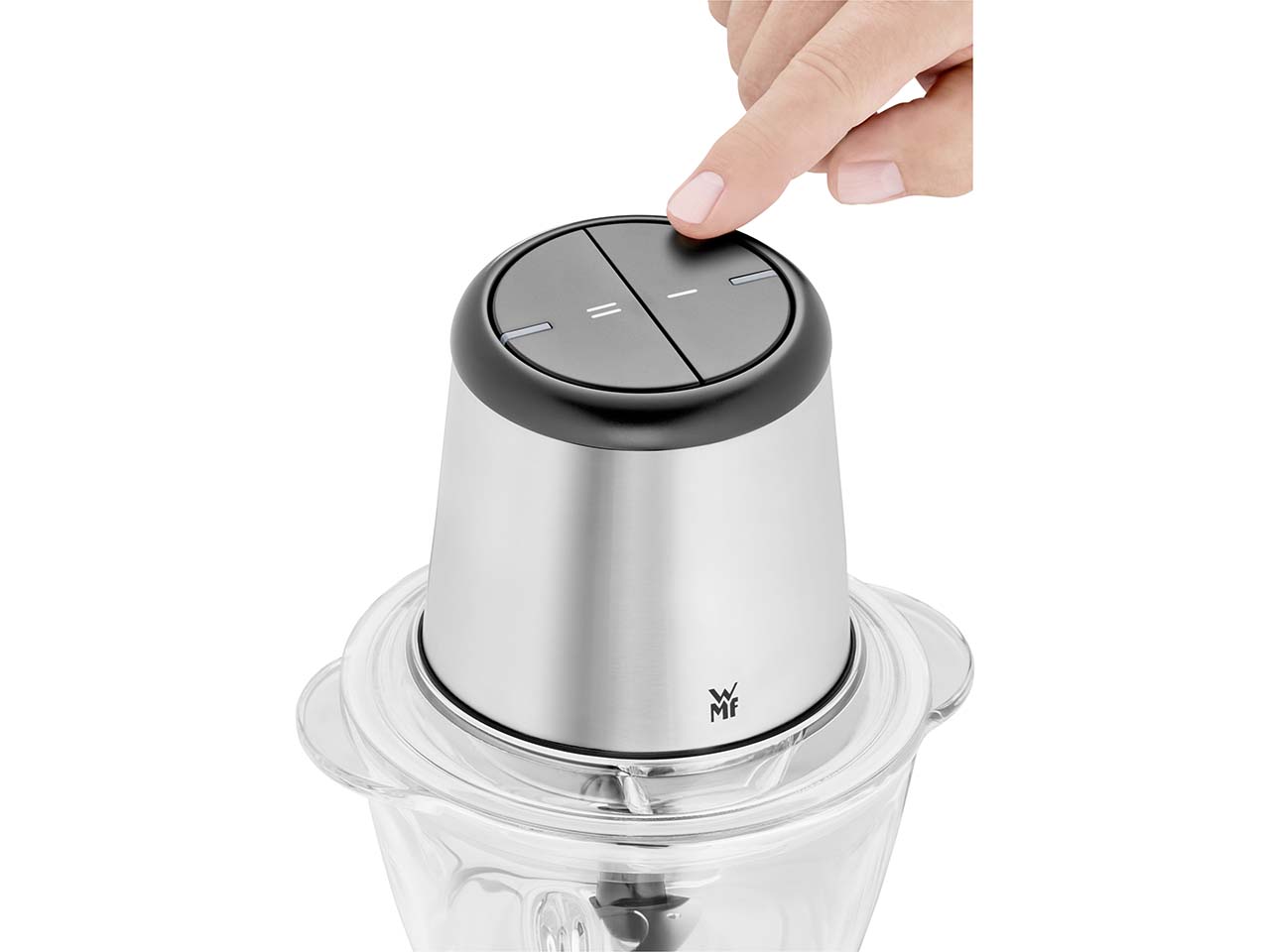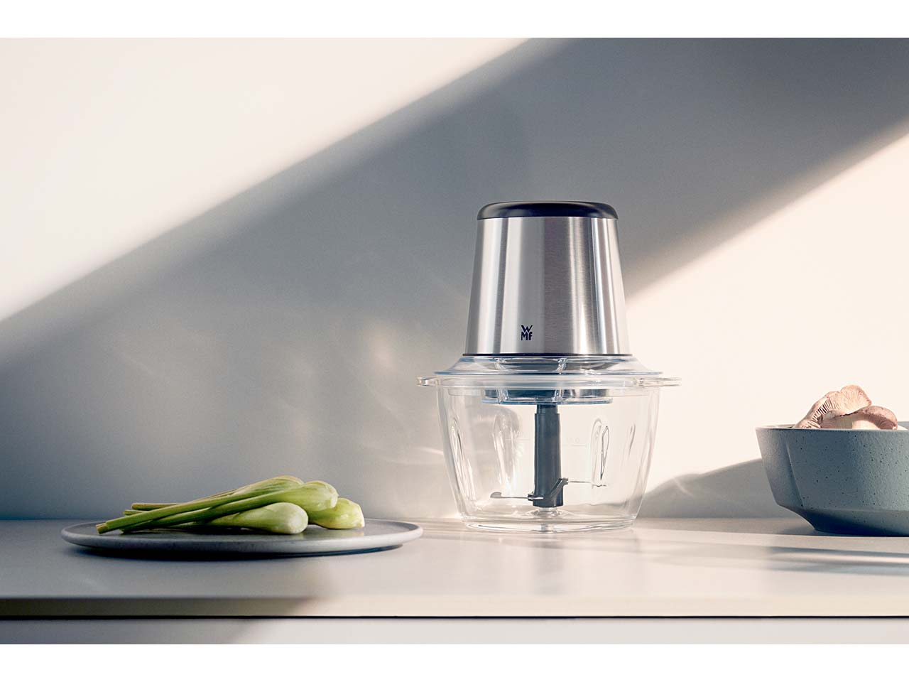 Ob Obst, Gemüse, Kräuter oder Nüsse – dieser Zerkleinerer von WMF hackt, mixt, mahlt oder schneidet es! Dafür verfügt das Gerät über ein 2-flügeliges Edelstahlmesser, das die Zutaten präzise verarbeitet. Der Zerkleinerer mit 320 W Leistung arbeitet in zwei Geschwindigkeitsstufen. Die zerkleinerten Zutaten landen im hochwertigen Glasbehälter. Das LED-beleuchtete Bedienfeld macht die Nutzung kinderleicht.