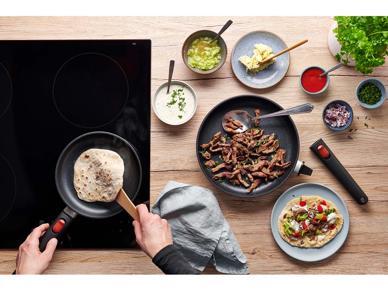 Für alle, die Qualität lieben und nicht auf Nachhaltigkeit verzichten wollen: Die Flachpfanne aus recyceltem Aluminium zeigt, wie umweltbewusstes Kochen funktioniert! Sie ist perfekt, um saftige Steaks zu braten, Ofengerichte wie Gratins zuzubereiten, Saucen zu kreieren oder Speisen schnell anzubraten. Woll hat eine Versiegelung entwickelt, die vollständig ohne PFAS auskommt – und trotzdem bleiben angebrannte Speisen nicht kleben. Die Diamond-QXR-Oberflächenveredelung verbraucht in der Produktion 30 % weniger Energie als vergleichbare Produkte, besteht aus natürlichem Quarzit, punktet mit einzigartigen Antihaft-Eigenschaften und ist dank eingelagerter Diamant-Kristalle besonders robust. Weiterhin zeichnet sich die Pfanne durch eine lange Lebensdauer aus. Zu dieser trägt auch der abnehmbare Stiel bei. Dieser besteht zu 50 % aus Holzmehl – einem Nebenprodukt aus nachhaltig beforsteten Wäldern in Niedersachsen. Funktionalität in Reinform: Der Rand der Pfanne ist so geformt, dass beim Ausgießen nichts daneben geht. Energiesparendes Kochen ist dank vollflächigem Induktionsboden möglich, der schnell und gleichmäßig aufheizt. Für alle Herdarten inkl. Induktion geeignet. In verschiedenen Größen erhältlich.