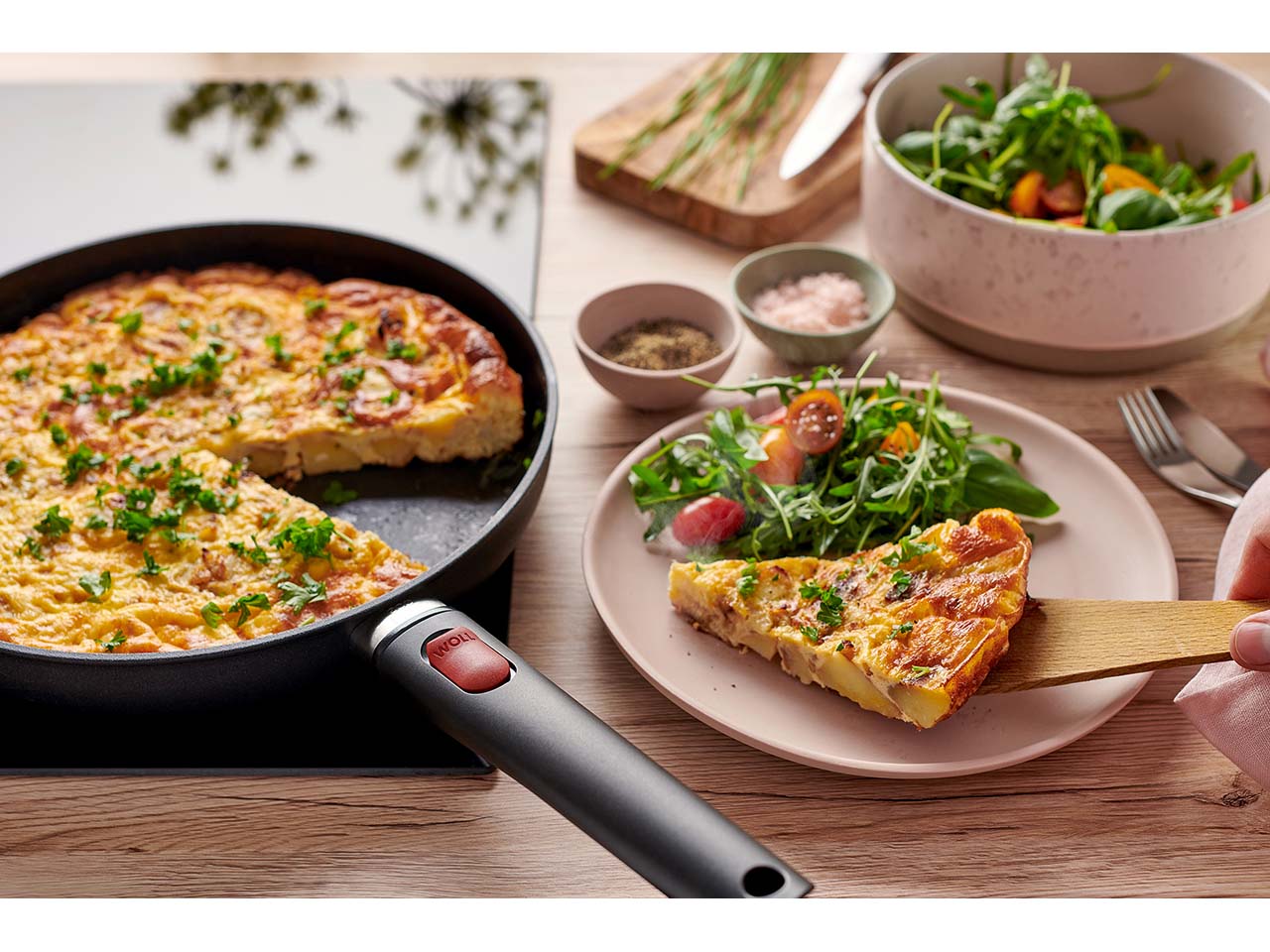 Für alle, die Qualität lieben und nicht auf Nachhaltigkeit verzichten wollen: Die Flachpfanne aus recyceltem Aluminium zeigt, wie umweltbewusstes Kochen funktioniert! Sie ist perfekt, um saftige Steaks zu braten, Ofengerichte wie Gratins zuzubereiten, Saucen zu kreieren oder Speisen schnell anzubraten. Woll hat eine Versiegelung entwickelt, die vollständig ohne PFAS auskommt – und trotzdem bleiben angebrannte Speisen nicht kleben. Die Diamond-QXR-Oberflächenveredelung verbraucht in der Produktion 30 % weniger Energie als vergleichbare Produkte, besteht aus natürlichem Quarzit, punktet mit einzigartigen Antihaft-Eigenschaften und ist dank eingelagerter Diamant-Kristalle besonders robust. Weiterhin zeichnet sich die Pfanne durch eine lange Lebensdauer aus. Zu dieser trägt auch der abnehmbare Stiel bei. Dieser besteht zu 50 % aus Holzmehl – einem Nebenprodukt aus nachhaltig beforsteten Wäldern in Niedersachsen. Funktionalität in Reinform: Der Rand der Pfanne ist so geformt, dass beim Ausgießen nichts daneben geht. Energiesparendes Kochen ist dank vollflächigem Induktionsboden möglich, der schnell und gleichmäßig aufheizt. Für alle Herdarten inkl. Induktion geeignet. In verschiedenen Größen erhältlich.