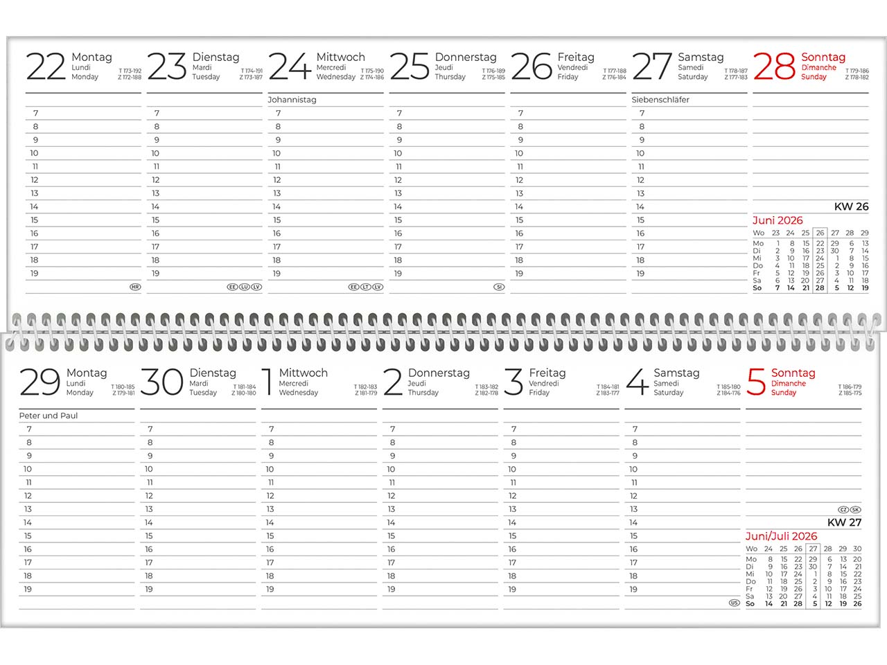 | Kalenderaufteilung: | 2 Wochen/Doppelseite |