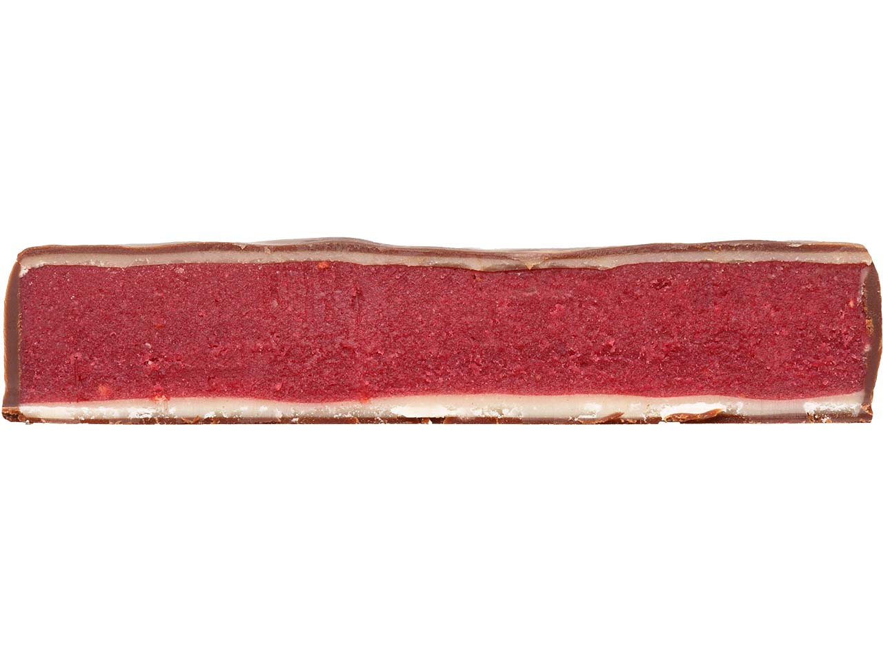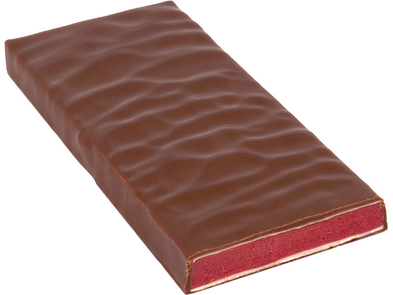 Fruchtig-beerig und gleichzeitig so schokoladig! Diese handgeschöpfte Schokoladentafel ist ein Genuss für alle, die es fruchtig-säuerlich mögen. Die tolle Farbe im Inneren entsteht allein durch die Himbeeren. Die Füllung ist umhüllt von einer hauchdünnen Schicht weißer Schokolade. Darüber befindet sich die Hülle aus Edelschokolade mit 70 % Kakaoanteil. Schon ein Bissen sorgt für eine einzigartige Geschmacksexplosion im Mund! Inhalt 70 g.