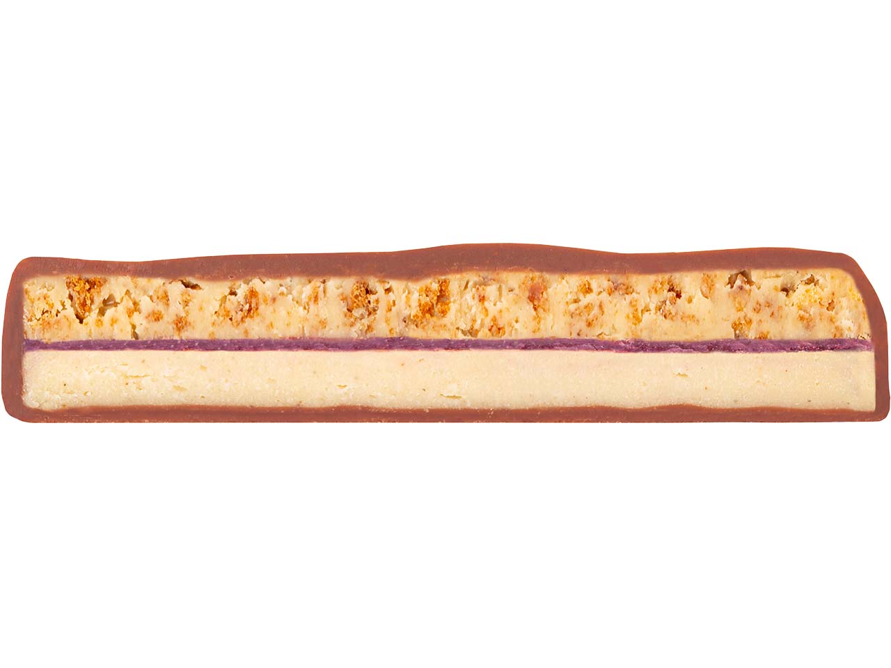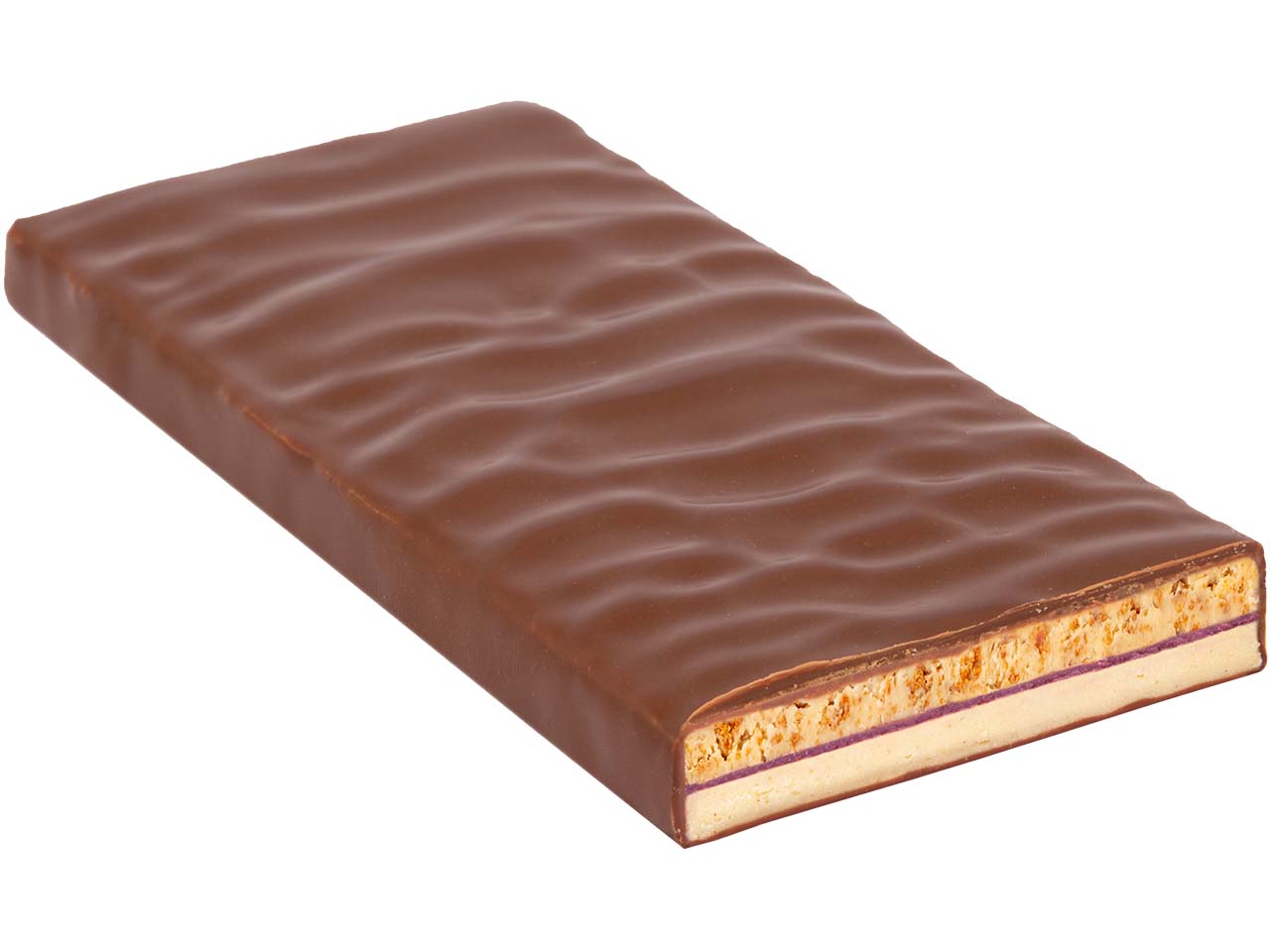 - Handgeschöpfte Milchschokolade mit Keks-Mandelnougatschicht und Cheesecake-Ganache